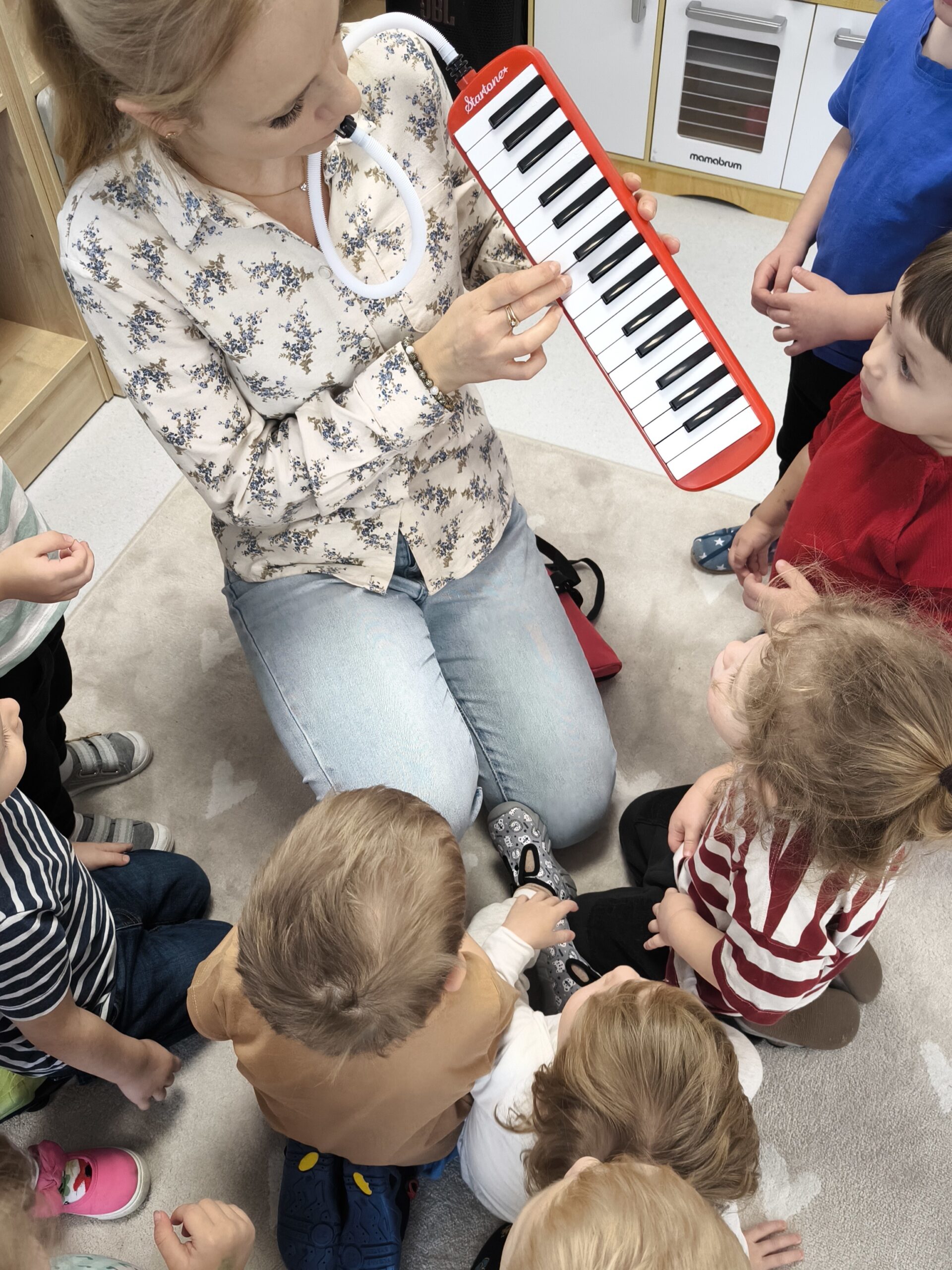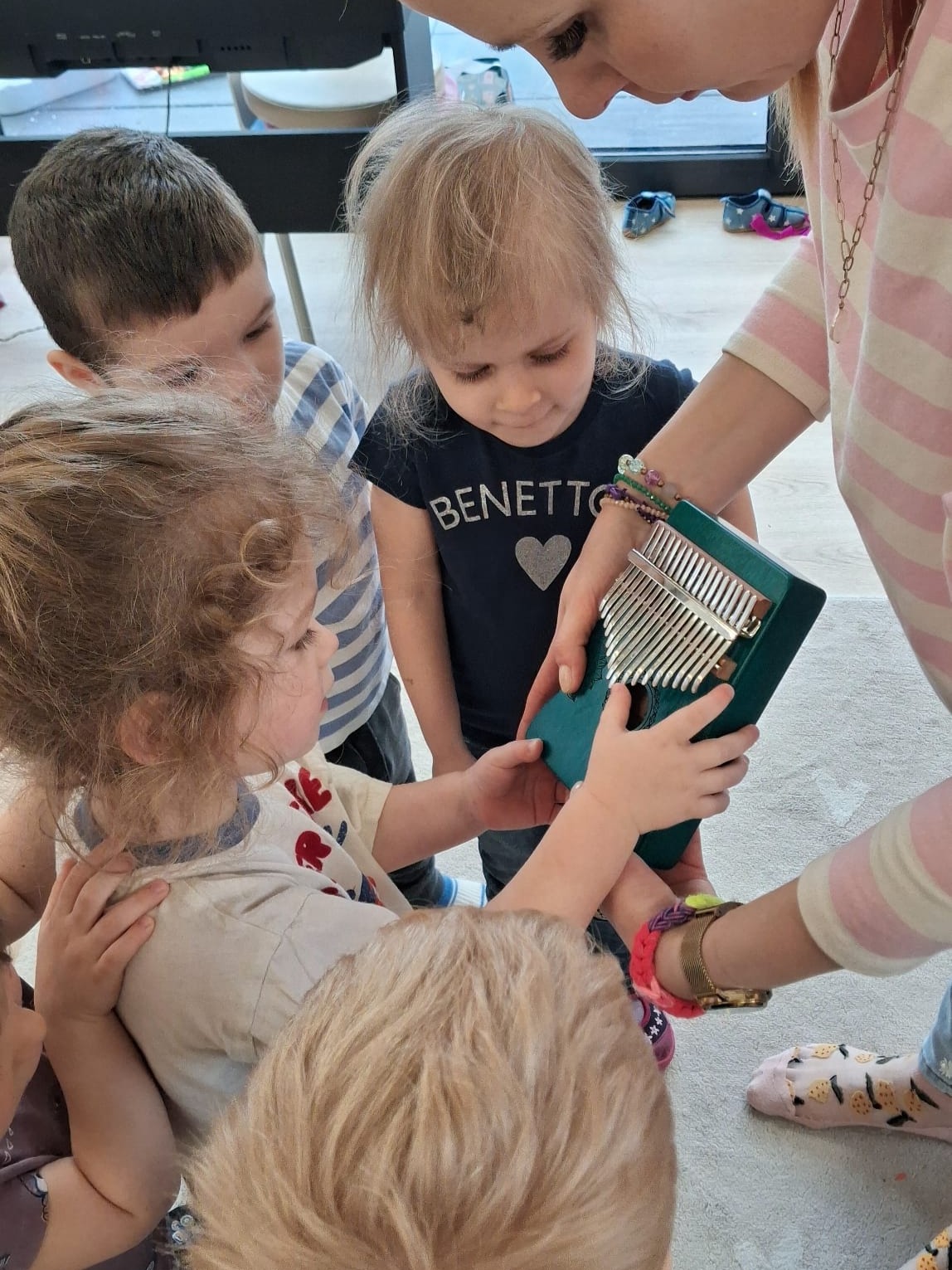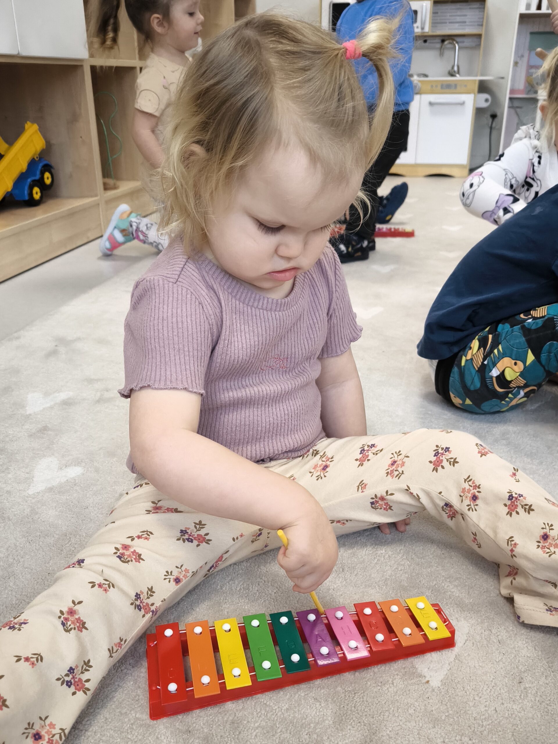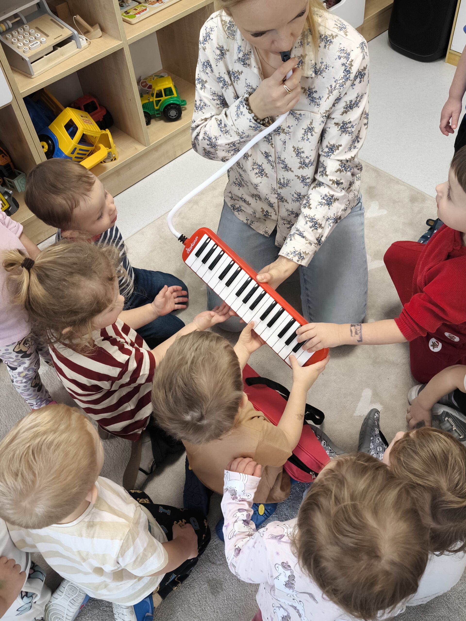 • Instrumenty muzyczne:  Tamburyn, grzechotka, dzwonki, flet, pianino. Dzieci mogą grać na nich, eksperymentować z dźwiękami i rozwijać słuch muzyczny.
